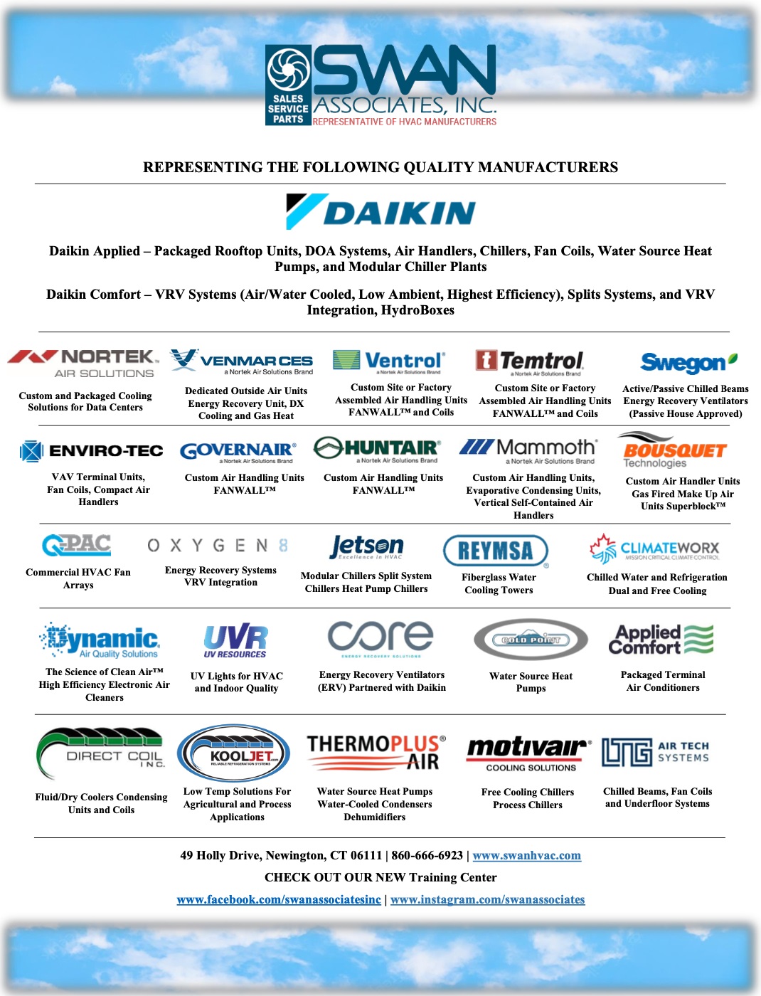 Swan Associates, Inc. was established in 1973 as a manufacturers’ representative organization, selling commercial HVAC products in Connecticut and Western Massachusetts. In 1978, in order to increase the level of service for our customers, a service and parts division was added. Today, with over 25 full time employees, Swan Associates provides outstanding design solutions and complete support to consulting engineers, building owners and mechanical contractors. Swan Associates has grown to become one of the largest independent representatives of Commercial HVAC for Connecticut and Western Massachusetts.